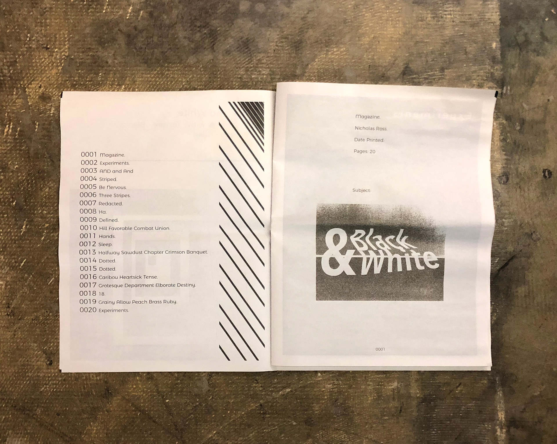 My goal with this project was to expand what I knew about typography, and how to make things that shouldn't work be able to stand on it's own. I wanted to push what I knew about editorial design and materials, and how to play subject matter off of the way the work is printed. I wanted to see if I could find meaning in meaningless random words through typography and editorial design.
